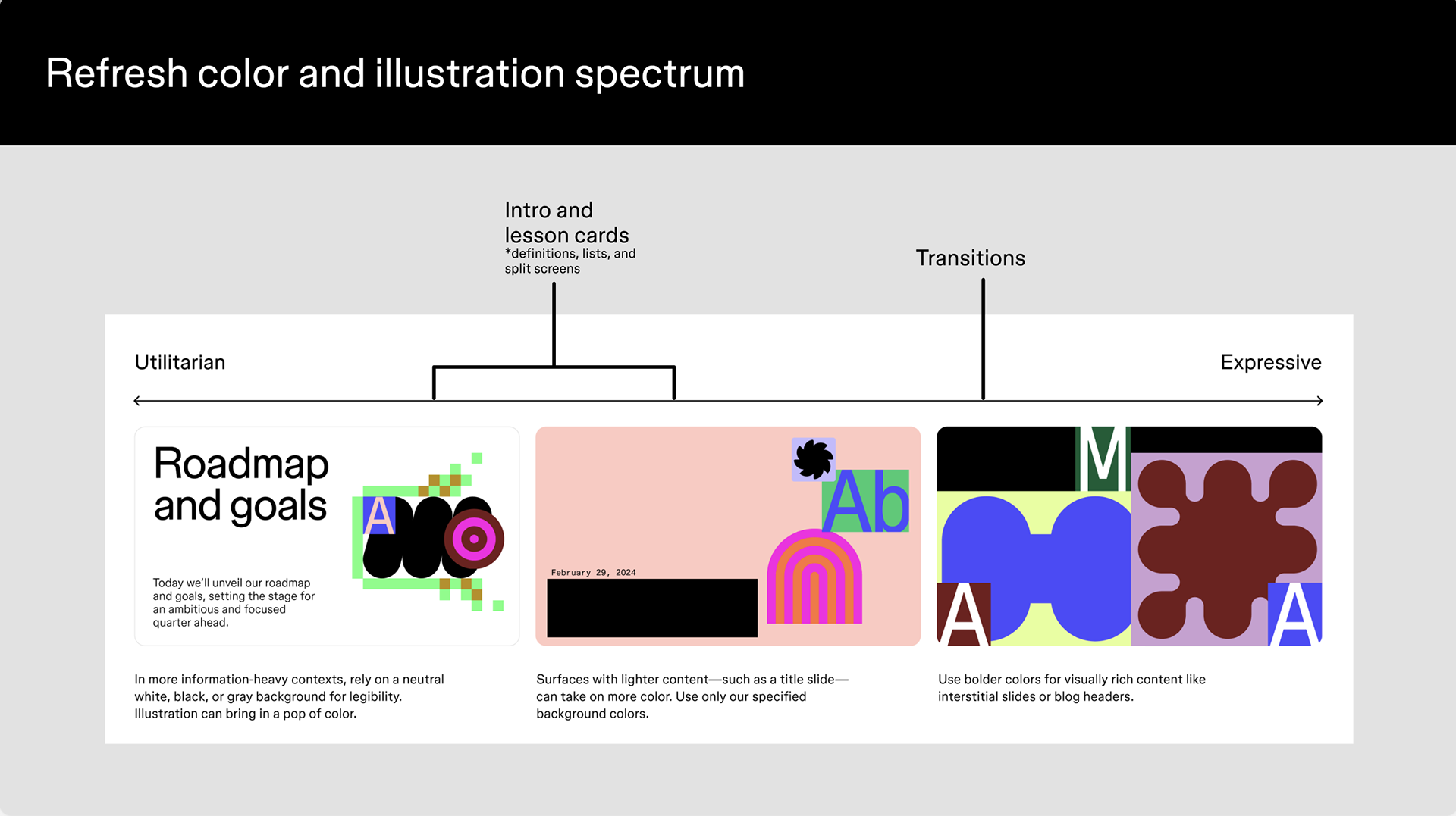 Since our designs for this course needed to align with a big, fresh set of brand guidelines, I first dove into our new brand book. I started by mapping out where our design assets fit on our brand spectrum. From there, I put together a moodboard to help us find the balance between expressive and utilitarian designs for educational video content, as well as some style principles for how to apply key brand elements like illustrations, color, and layout.